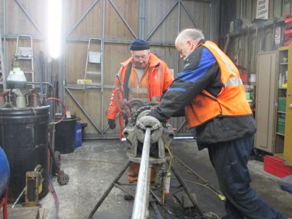 9. In the shed, Dick Gunn and Don Newnham were busy preparing new steel pipe prior to replace several sections of rusty and corroded point-rodding at the Barnstaple end of the station.