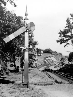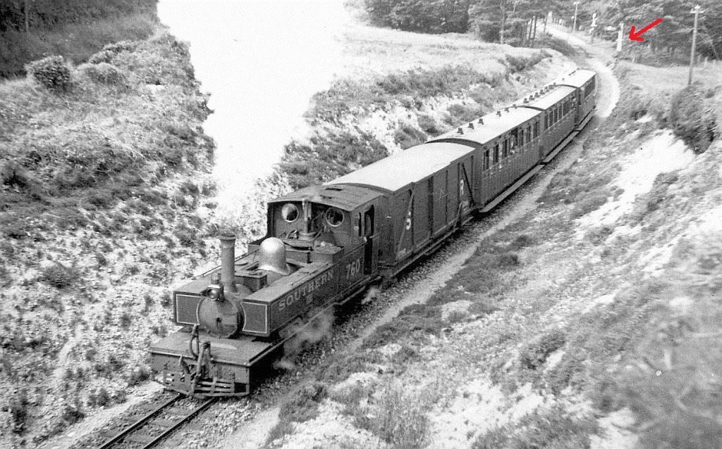 EXE heads for Lynton 1935. The signal (red arrow) was located on the "wrong" side of the track to improve visibility for Barnstaple-bound trains on the bend.