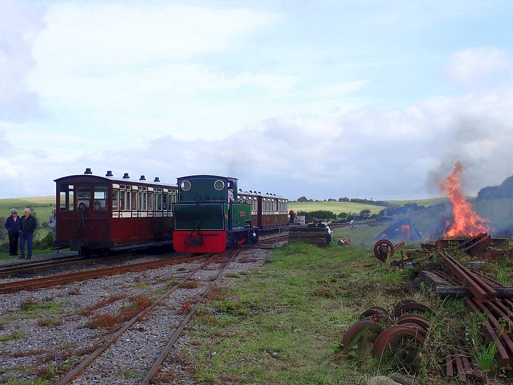 18. The cleared material was consigned to a bonfire under the care of Anne - just visible through the haze as ISAAC runs round a train at Killington Lane.