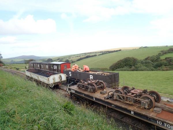1. Early in the day Jonathan, Dave and Graham were (yet again!) sorting and cutting scrap wood for loco firing. Van 23's bogies are on the flat wagon in the foreground awaiting attention.