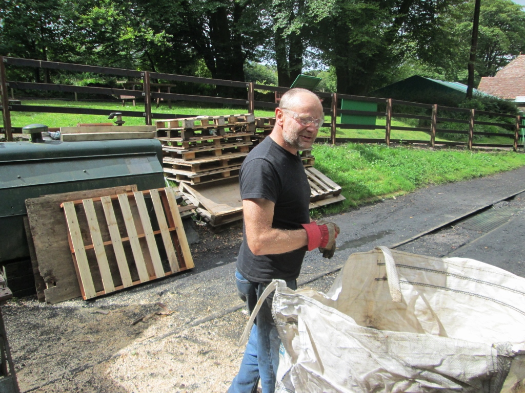 2. Graham Varney about to resume cutting up old pallets for use in lighting the steam locomotives each day.