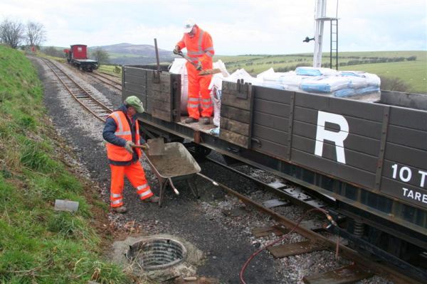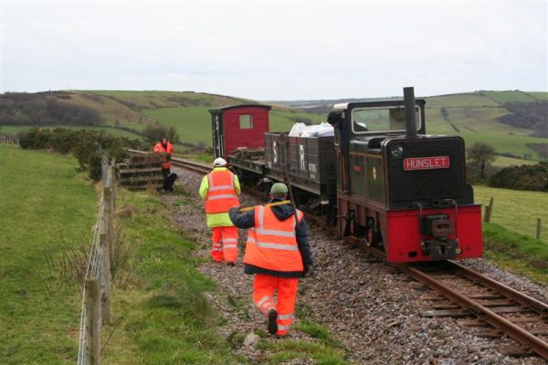 14. After lunch, with drier weather now, a works train with HEDDON HALL in charge, took some of the gang down to the sleeper stacks to collect more of the scrap sleepers for disposal.