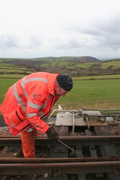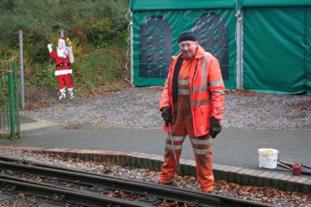 3. 'Santa' keeps an eye on signalling engineer, Dick Gunn who was on site carrying out the periodic greasing of the moving parts of all the turnouts at Woody Bay.