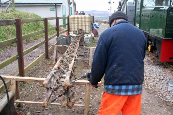 5. Graham Varney removing concrete from the base of the LSWR Lattice post signal, formerly from Heddon Mill on the Barnstaple-Ilfracombe line.