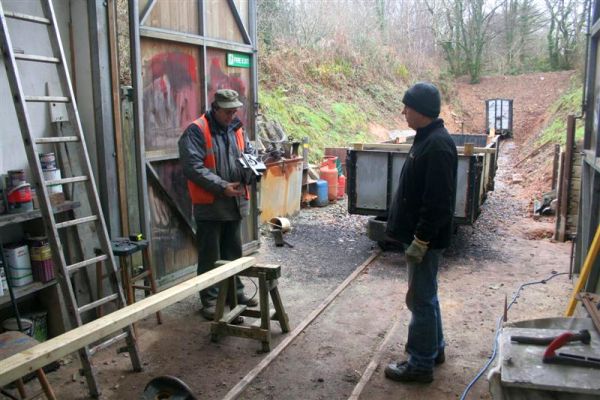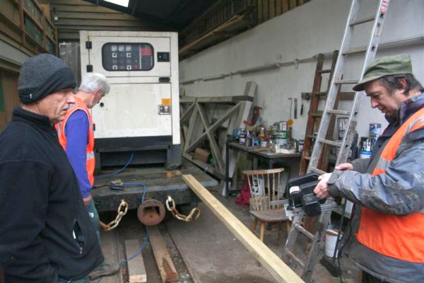 6. In the shed Jim McFarlane and Dave Bloomfield discuss the next stage of the wooden frame requirements for the bogie open wagon cover.