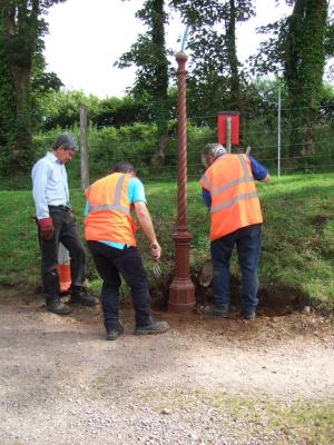 13. The Great Lamp post Project was tackled today by Keith Lamprey and colleagues. This was to install heritage lamppost at the start of the path to the toilet block. The post had been cleaned up and red oxide painted in preparation for installation. Notice the beautiful cast detail of the post. The base of the lamp will fit over the spigot at the top of the post while the cross bar (originally to support the lamp lighter’s ladder) will fit in the hole towards the top of the post.