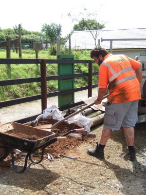 16. By the end of the afternoon Keith and Graham, under the watchful eye of today’s controller, Dave Evans, the post was in place. 17.With the assistance of Ali Burgess soil was rammed around the post base. Note the ducting for the cable sticking out of the top of the post.