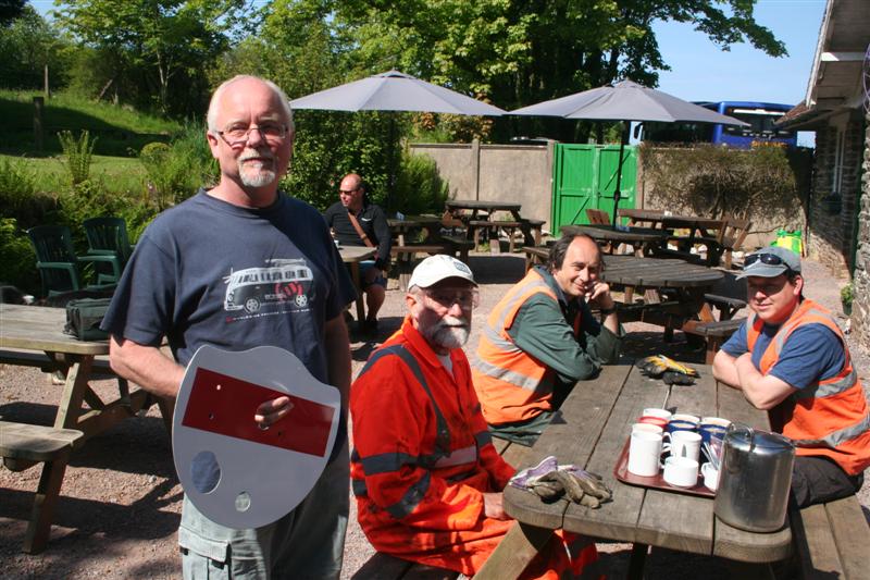 1. Today the Thursday gang welcomed its newest member. Jim Pounds has been involved with the railway for over 20 years, volunteering at all levels but mainly at weekends. Recently retired, he is now able to join the mid-week working parties and this morning arrived at Woody Bay today in time for the morning tea break! His first task today was to replace the shunt signal disc at Killington Lane with an SR pattern version.