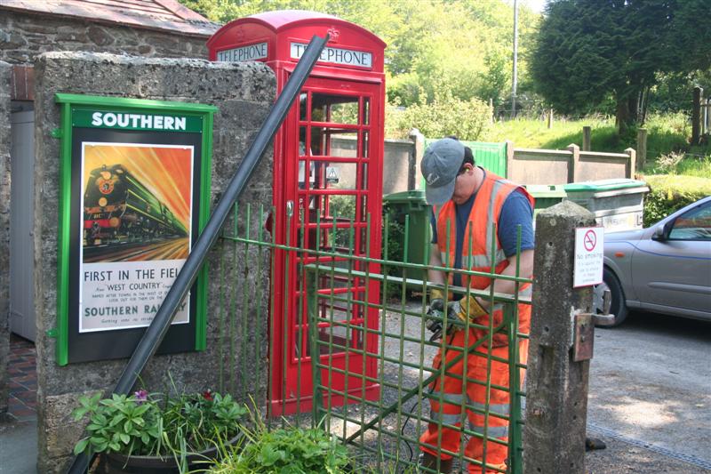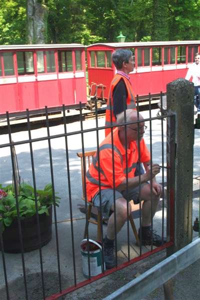 6. After lunch it was time to start on the gates. Andy wire brushes the iron railings near the gate. This area at Woody Bay is the entry to the station and the repainted railings will make this area look cleaner and tidier and also continue the SR image of everything around the station site.