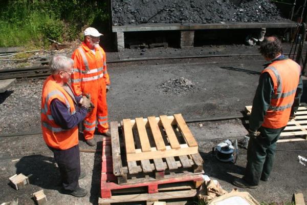 3. Several old pallets needed cutting up for the firewood used to light the fire of the steam locos. John Villers, Mike Corner & Dave Bloomfield prepare to attack the pile of old pallets.