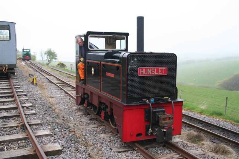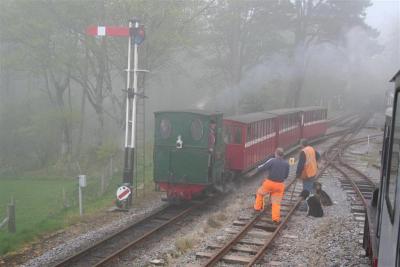 2. As the sea mist descends SID departs Woody Bay with an afternoon service past the p.w. gang working on the headshunt.