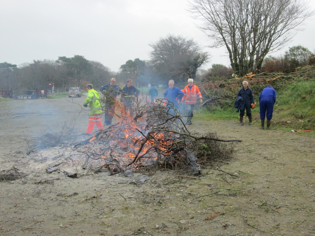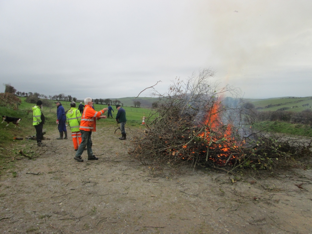 1. In the car park a bonfire was lit to dispose of the pile of branches cut during the A39 hedge laying programme.