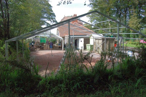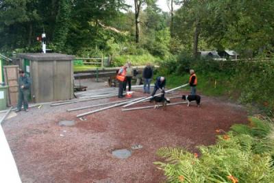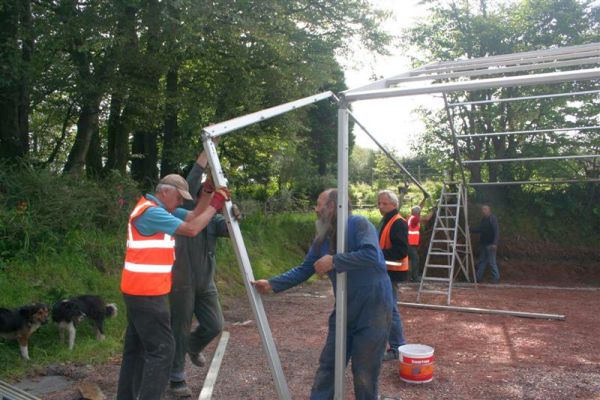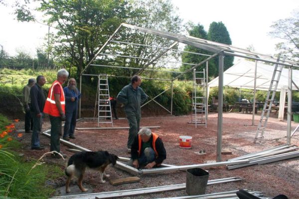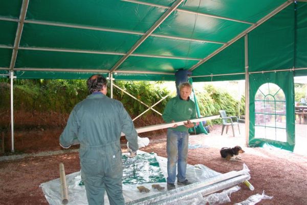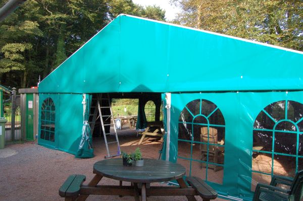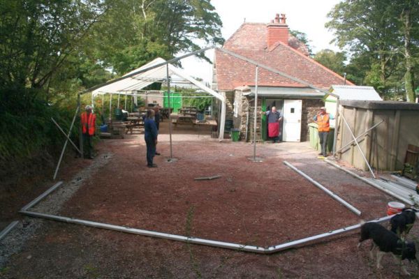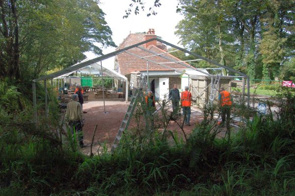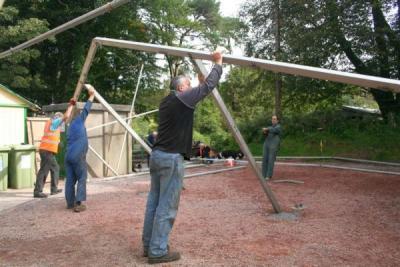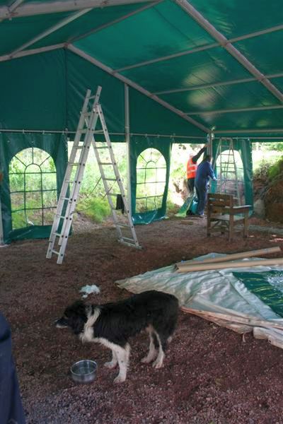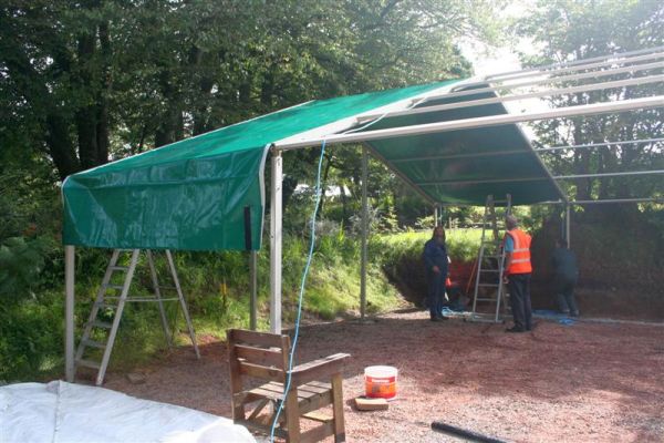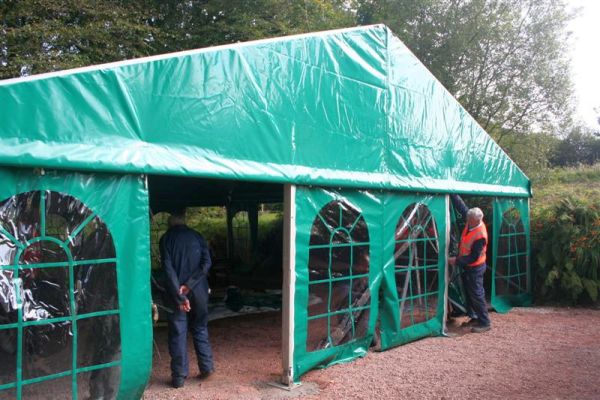 13. After lunch the first cover of the new marquee - in ENPA-approved green - is winched over the frames