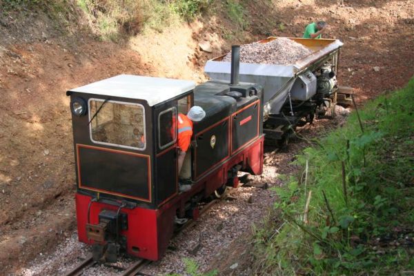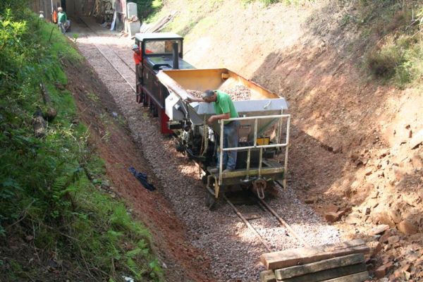 21. Hunslet diesel HEDDON HALL with the ballast hopper tipping more ballast into the side cesses.