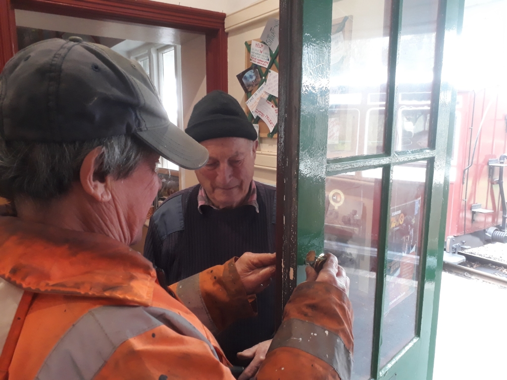 6. Dave Evans and Jim Price busy fixing a new lock to the Station Booking Office door.