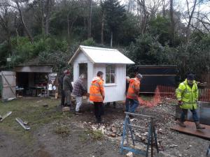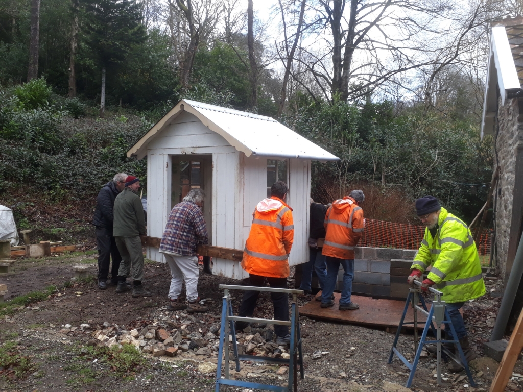 In the morning a gang assembled at Chelfham. The partially restored original signal cabin had been readied for this a move back to its original location.