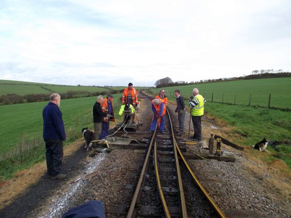 Today's weather started bright and clear with a few dark clouds threatening rain. So with a reasonable number of volunteers on site we boarded the train for Killington Lane. As the running season is over for 2013, we are able to carry out work on the track without interfering with passenger trains.