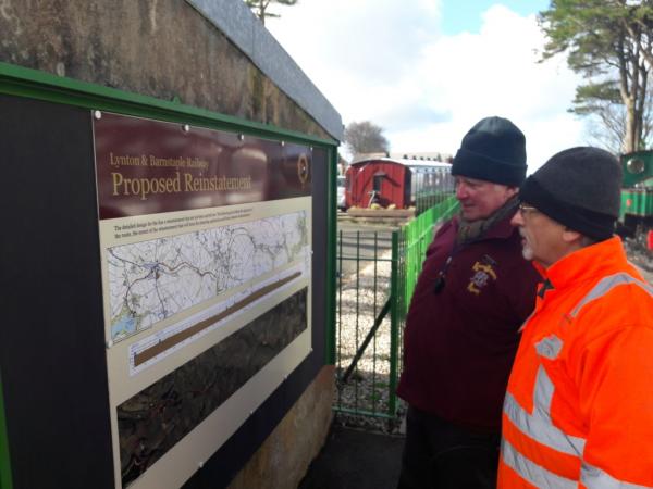 13. Tuesday's great news from Exmoor National Park was well received by everyone at Woody Bay. Guard Bob Ayres and Dave Drayson re-check the extension plans route map of the proposed reinstatement on display on the side of the stable on the up platform.