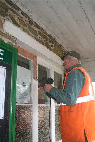 1. First of all we welcome back Jim Price to the Thursday outdoor gang. Jim had been keeping warm on the footplate all season being AXE's Thursday fireman. Jim now takes on the project of restoring more of the window frames around Woody Bay Station. Jim begins by scraping off old paintwork from the platform window of the former ladies waiting room.