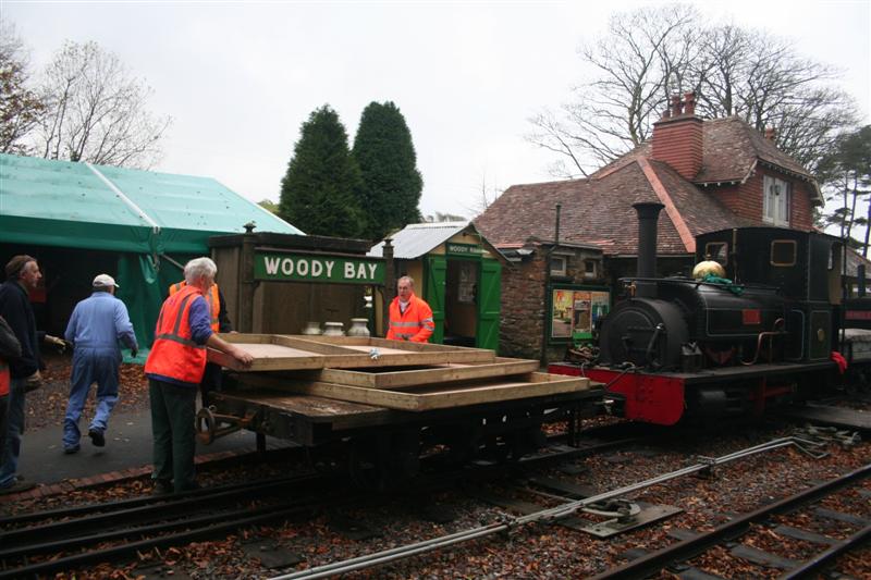 3. The gang's first task today was to collect the stored plywood sections of Santa's Grotto. An unusual shunt move resulted in HEDDON HALL hauling on loan locomotive LILLA with the wagon of boards on.
