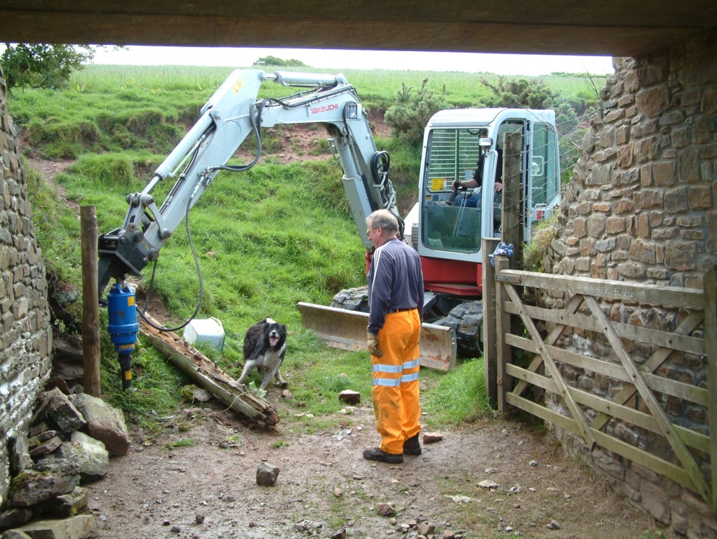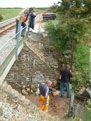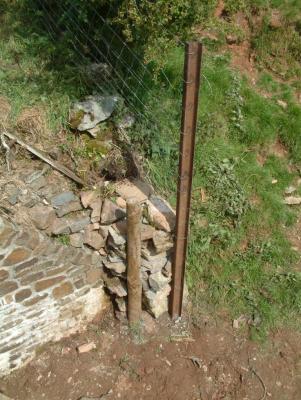 The main task today was the replacement of a decayed fence post at Bridge 67. The existing post was a long section of old telegraph pole which was well past its sell-by date. After the fencing wires attached to it were removed the post fell at the first gentle push. Once again the post hole auger proved its worth and within 10 minutes had bored a 4' deep hole ready for the "new" post. In pre-auger days this would have been a very difficult and time consuming hole to dig so, once again, we were extremely grateful to all those who had contributed to this piece of equipment. The replacement post was a 13' long section of rail which had been prepared previously. It was concreted in, line wires and sheep netting attached, a small section of dry stone wall erected and by 3.30 the job was done.