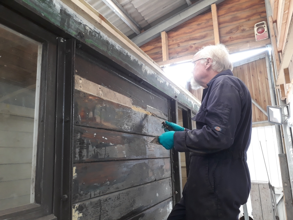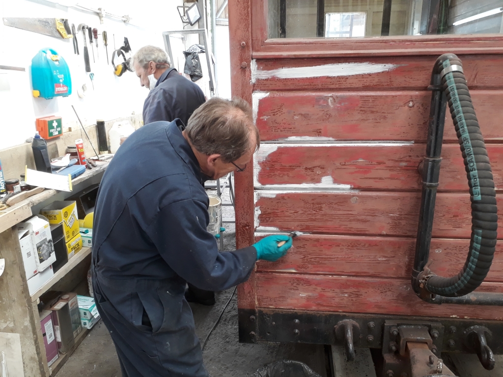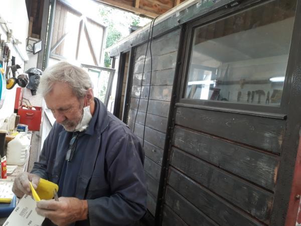 8. .....whilst Jim Pounds applies more filler to another repaired area of this wooden-bodied ex MOD Brake Van.