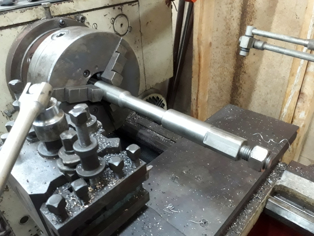 9. in the workshop, this is a newly machined signal arm pivot rod which has just made in the lathe by Peter Wainwright.