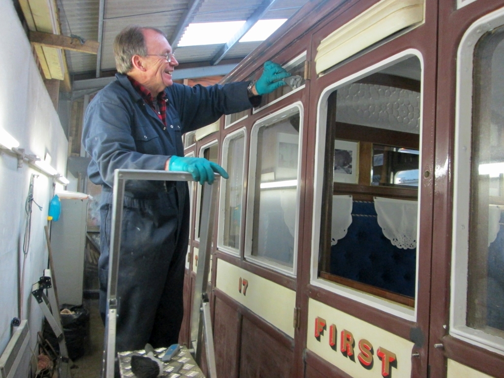 10. In the shed, work on Carriage 17 progresses steadily. Barrie Cann has now been "promoted" as he is now working by the First Class compartment…..