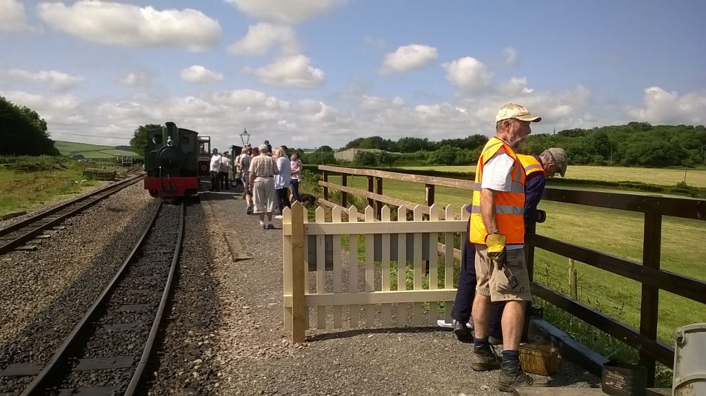 3. AXE arrives with the train whilst Mike Corner and Don Wood paint the fencing around the ground frame.