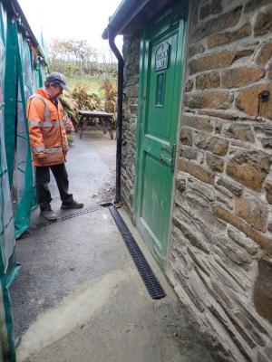 10. & 11. Under Dave's guidance, Roger, Graham, Dave and Dave (yes - 3 Daves on the same job - bit of a communication problem!) renovated the kitchen rear door step and installed a drain to try and prevent flooding and rotting of the timber doorway.