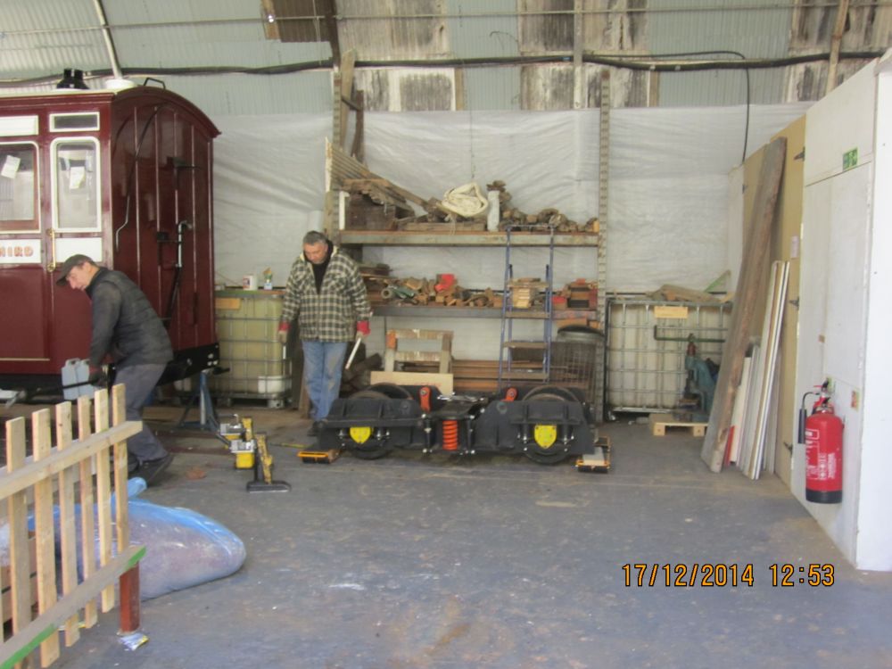 During the winter close-down, all the carriage bogies are taken out from under the carriages, cleaned and thoroughly checked, adjusted, lubricated etc. (See HERE for how the Thorpe Park bogies were done back in 2011). Having a spare bogie at Woody Bay will help the winter maintenance team get the vehicles ready in time for the first trains of the 2015 season.