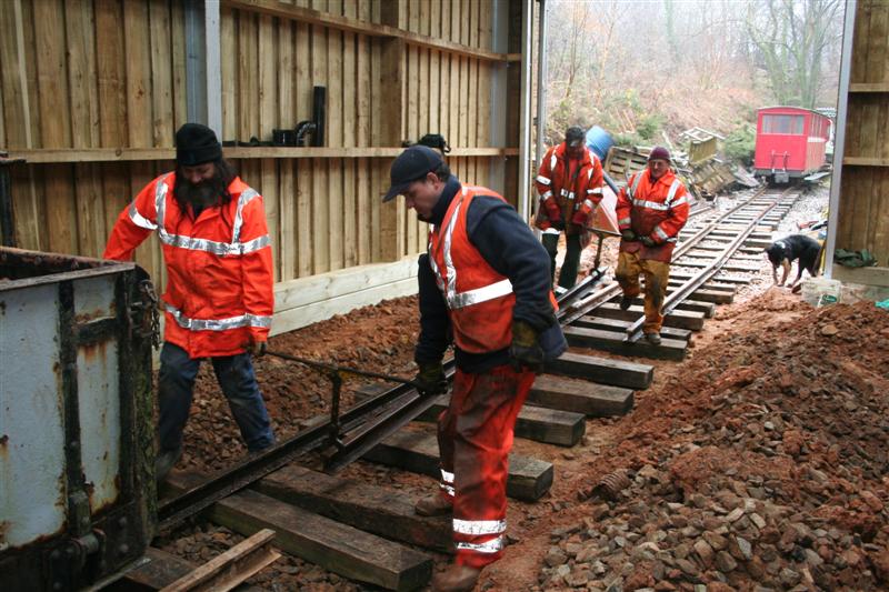It was a very wet, misty, and damp day at Woody Bay today for the Thursday Track Gang but the task on offer was actually indoor tracklaying! With the completion of the shed extension, and the digging out of the trackbed there, the job of laying the track linking up the existing track in the shed with that of the 'Lynton siding' in the cutting was able to be completed today almost completely inside the shed.