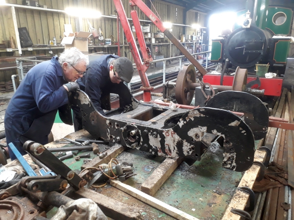 14. In the workshop, Peter Wainwright and Tom Woods carrying out repairs to the pony truck of Bagnall locomotive CHARLES WYTOCK.