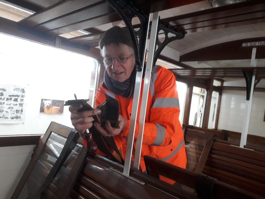 18. Phil Dixon affixes new leather window straps recently purchased from a local supplier.