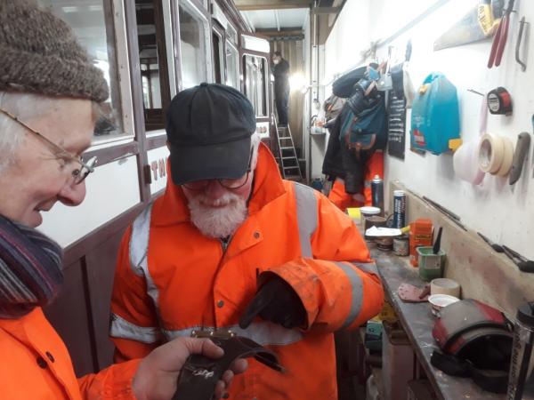 15. Activity in the Paint Shop as Jim Pounds and Phil Dixon discuss the carriage straps Carriage 11.