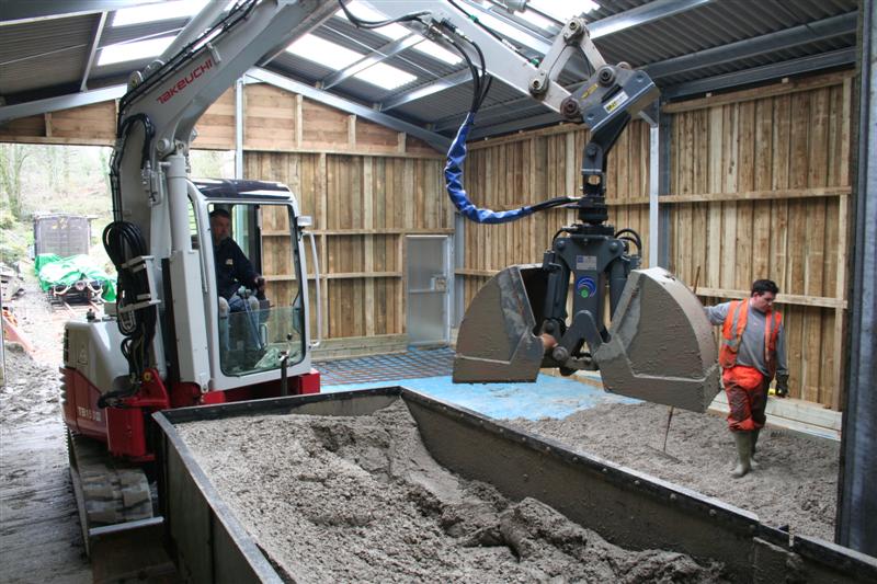 2. In the shed the digger unloads the dry mix onto the sides of the track 0930-1030