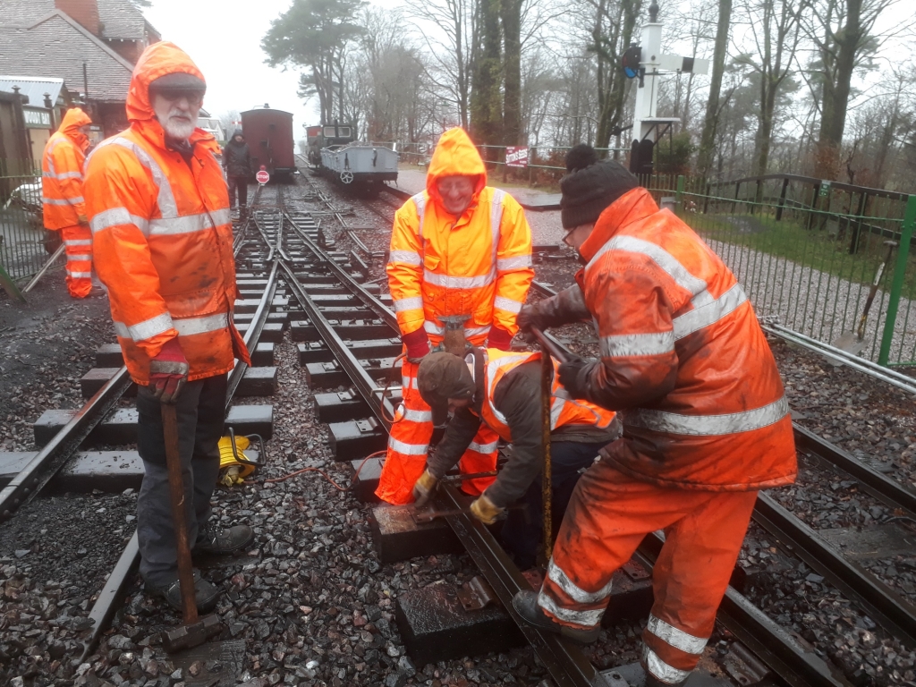 1. 2. & 3. It's all orange coats, and leggings as the rain persisted. In the morning, the gang begin to drill holes and screw the new bolts to secure the plates to the sleepers.