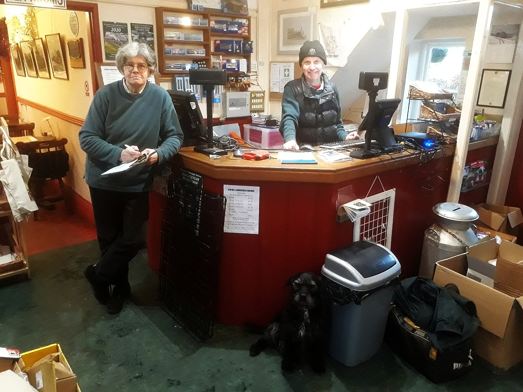 12. Sensibly keeping dry inside Woody Bay Booking Office and Shop were Anne Belsey, Dave Tooke and Dexter Dave's dog.
