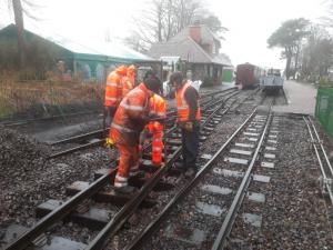 Despite the heavy rain, the track gang continued to finish off securing the pit-road turnout sections to the new sleepers laid last week.