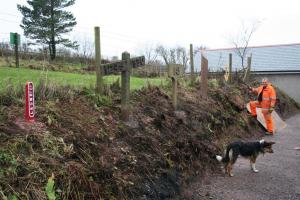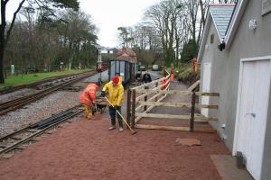 The work of the Thursday group of volunteers at Woody Bay continued today. With the wooden fence leading to the new toilets completed last week, this mornings work was to move and spread a load of scalpings and chippings in front of the new volunteers building. This area in front of the new buildings also forms the safe and level access into the mess room. Also, two more railway lineside items were added to the display along the embankment leading tothe toilets.