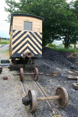 In the shed over the pit the brake rigging will also be regauged and adjusted to fit the wheelsets. Temporary wheelsets (borrowed from a box van) are being fitted to the brake van to enable its move to the shed.