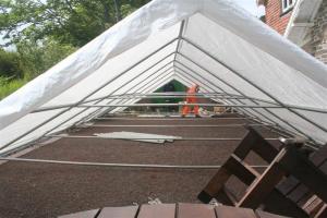 A new party-tent marquee was delivered this week and the Thursday gang were tasked with the job of constructing and erecting the new marquee. This marquee is positioned on the former lower lawn (now a levelled stone area) and during the periods throughout the season that it is erected, provides cover for the visitors using outside tea rooms.