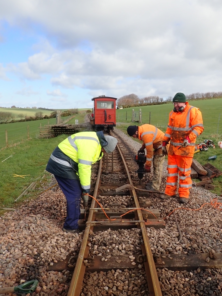 13. Here in the foreground, new volunteer Glyn drills the sleepers, while Chris waits with the ready greased track screws to be fitted. In the background Nick uses the powered nut-runner to fit other track screws.