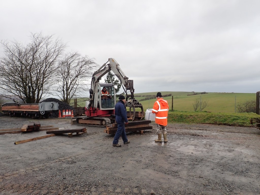 2. & 3. The grab attachment on the mini-digger made the moving of these (heavy) sleepers much easier. With Martyn in the digger, Anne and Keith checked off the sleepers needed for each location. In the foreground are two ex-MOD buffer stops procured recently for future use. These will need to be re-gauged – another job for a Thursday!