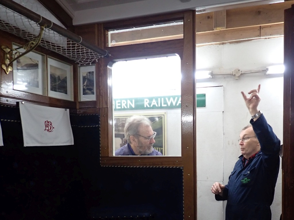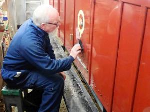 7. & 8. In the paint shop, Jim attended to some varnish defects that had annoyingly appeared over the holiday period. Geoff and Barrie worked on the First Class compartment – although Barrie’s gestures might suggest that they were having a theological discussion about heaven and hell or perhaps talking about the highs and lows of the job!
