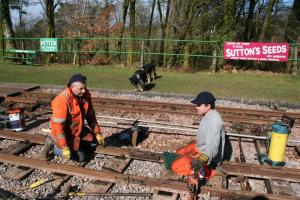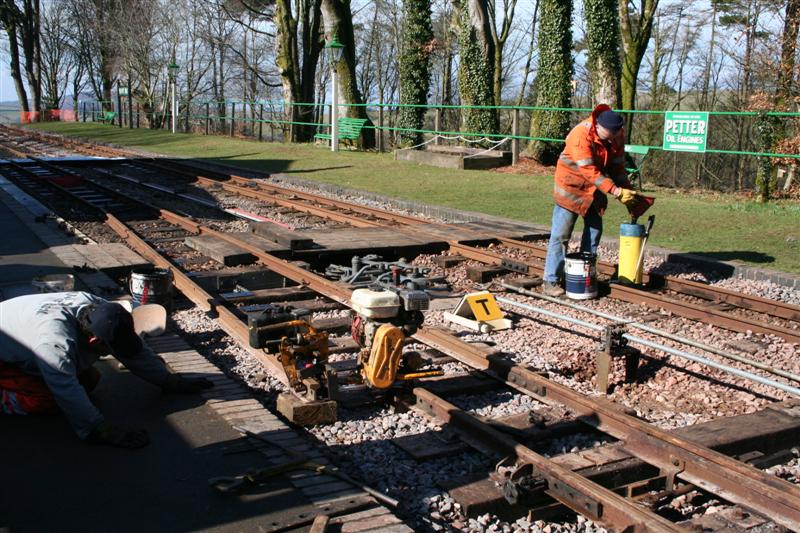 Today there was more work in and around the new toilet/volunteers block with some painting and electrics. The track gang spent the day adjusting a short section of the new track recently laid in front of the signal cabin, including drilling a couple of fishplate bolt holes and using several shims to repack the rail joint flush together giving a smoother ride across for the locos and train.
