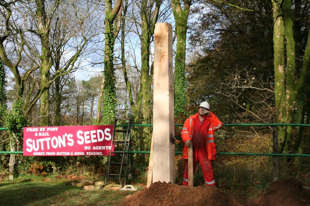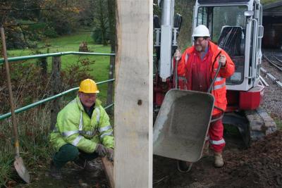 6. Martyn Budd (right) seems happy that the post is upright whilst final packing of the concrete is underway.