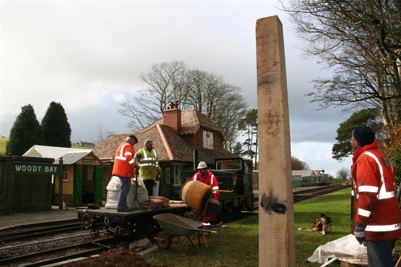 On Thursday Martyn Budd was able to position the mini-digger at the end of the platform to dig the hole for the new wooden tapered signal post. Martyn was able to identify the exact position of the original railway signal after discovering the remains of the base of the ironwork of the old signal ladder during the digging of the hole for the base. The hole was dug and the new treated seasoned oak post lifted into place.