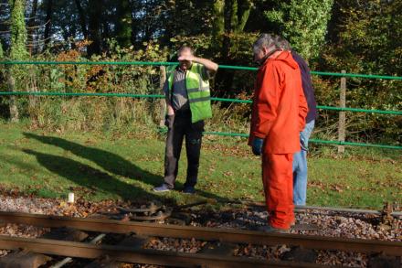 1. Dick Gunn (in orange) joined us again today, working on the last piece of rodding for the down end crossover. It's a bit early in the morning for difficult decisions and Brian our volunteer plumber, carpenter and general handyman from Combe Martin has to shade his eyes from the glare of the morning sun.