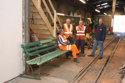 2. Richard Willey, watched by Brom Bromidge, John Villers and Martyn Budd needs little persuasion to test this station seat allegedly from 'Barnstaple Town'. All that seems to be missing are cups of tea.